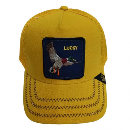 Gorra trucker de Goorin bros de la colección Animal Farm, formato de baseball redonda. Cinta interior para el sudor. Talla unica ajustable, Largo de la visera: 6.5 cm, Altura de la cabeza: aprox. 12,5 cm. Colores: frente, visera y rejilla amarillos.