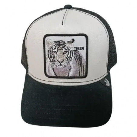 Gorra de estilo beisbol, ajuste posterior. Visera ligeramente curvada. frontal y visera de tela negra. Parche frontal cosido fondo blanco y bordado de tigre siberiano.