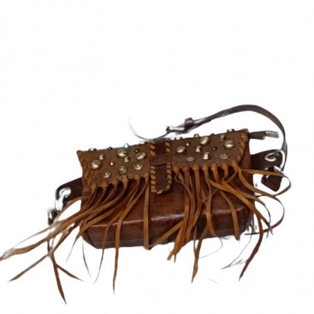 Bolso formato plano de un único compartimento con 2 bolsillos, uno interior y el segundo exterior al frente debajo solapa cerrados con cremalleras. Interior forrado. Color marrón natural, decoración de tachuelas bronce y flecos de la misma piel.