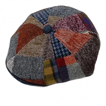 Gorra de paño de lana en piezas de diferentes paños de lana, formato newsboy o irlandesa, la visera del mismo material en paño de espiga gruesa herringbone azules, fabricada por Lucky Hat en Italia para Araras Sombrerería. Gorra atrevida, ideal para quien busque un look atrevido.