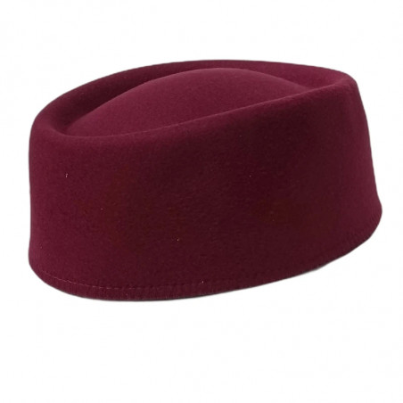 Sombrero tipo pilbox (pastillero). Sombrero de vestir fieltro de mezcla de algodón y poliéster, con badana cosida en el interior, color: burdeos. Interior sin forro. Versión sencilla