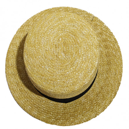 Sombrero canotier  de copa de 9 cm ala plana y corta, Decorada con cinta negra.